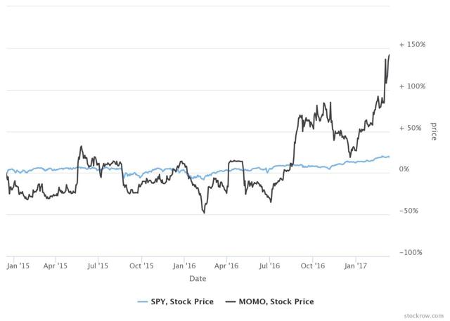 陌陌自上市以来,股价涨幅超过140%,轻松跑赢指数。