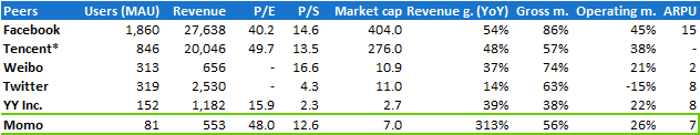 跟同行业比较,就市销率来说,陌陌比Facebook,腾讯,微博都要便宜,但是比YY贵。虽然公司利润率更高,成长也更快,但很多都已经反映在股价里了,而且公司用户数暴涨也跟基数小有关系。嗯,这么一看,发觉YY特别便宜,也许可以关注下。
