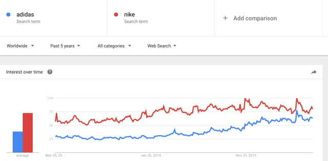 值得注意的是,耐克的搜索量过去几年内变化不大,相比之下,对阿迪达斯的搜索一直稳步上升。