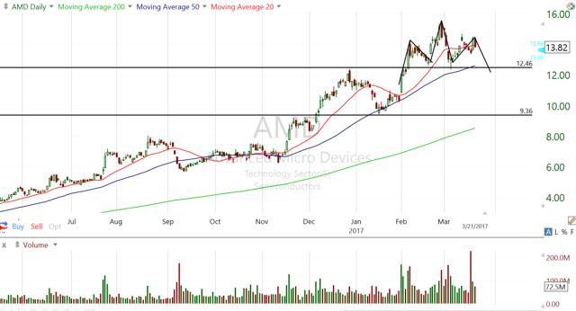 目前AMD悬在20日均线上,看起来似乎要往12.46的位置发展,可能显示市场调整的预期。当然,长期投资者不用担心。如果投资者真的因为恐慌出现了超卖,长期投资者可以趁机吸纳。