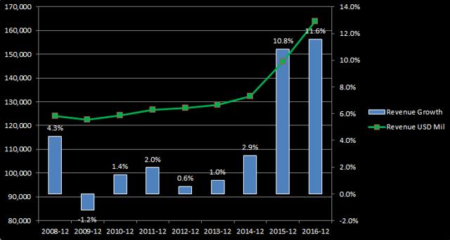 公司管理层一直在竭尽全力增加营收和营运现金流,值得注意的是,2015年及2016年营收增长明显加快。不光是营收增长,2016年公司营运现金流也创下新高,全年营运现金流超过393亿美元,增幅达9.7%。