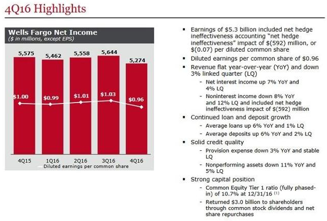 富国银行2016年第四季度每股盈利下跌6.8%。不足为奇,2016年小摩表现优于富国银行。