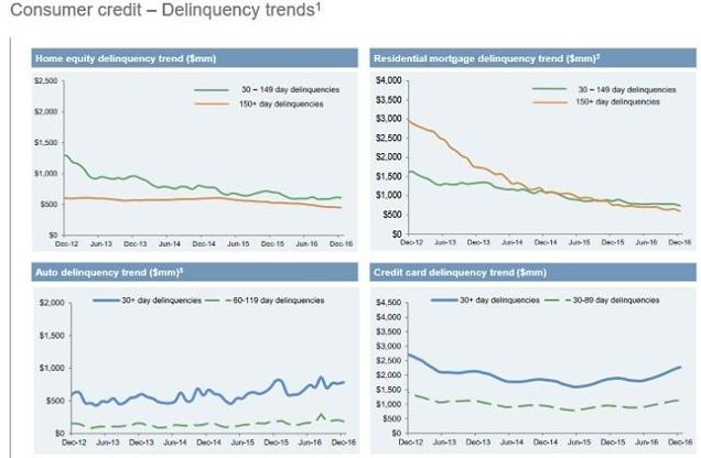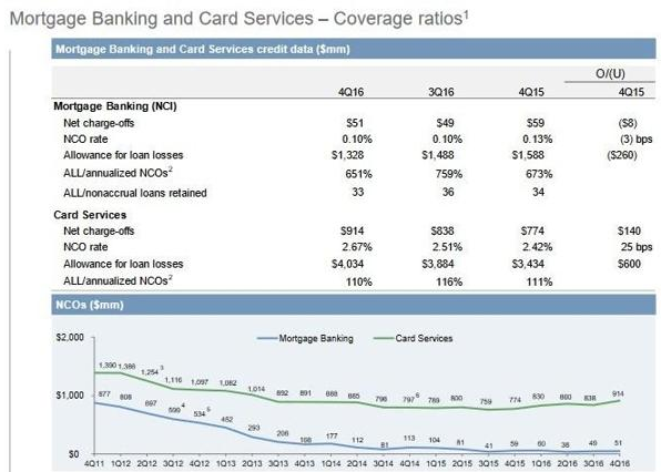 小摩是美国第二大抵押贷款发起商和服务商。小摩2016年第四季度的平均抵押贷款同比上涨6.1%。此外,由于数字化革新的进行,消费银行业务成为小摩的核心业务。上季度赊销和现销金额同比增加11%,公司移动端的活跃客户增加16%至2650万美元。