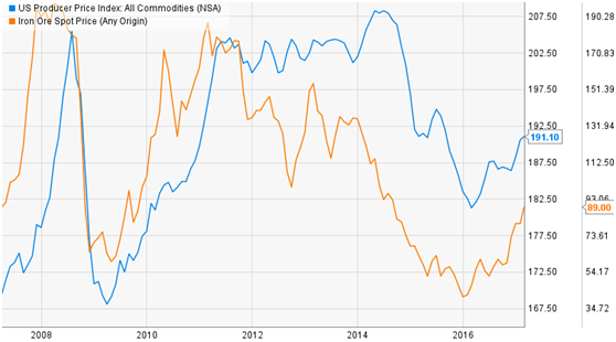 而且,铁矿石价格和美国通货膨胀率有着较强的相关性,其关联度达到0.71。虽然铁矿石价格不是推动美国通货膨胀率的罪魁祸首,但是由于铁矿石在工业生产中扮演着重要角色,通货膨胀上升的最重要愿意就是推动铁矿石价格上升的原因,其实就是经济的复苏,经济活动的加速。