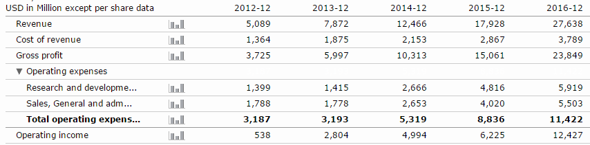 过去5年,脸谱的营收以56%的复合增长率增长。预计未来市场对数字广告市场的投入将以年均15%的速度增长,投入资金也将由2016年的1950亿美元上涨至2020年的3350亿美元。脸谱2016年的营收为276亿美元,市场份额占比为14%,仅次于谷歌,它所占市场份额高达46%。此外,截至2016年12月,脸谱拥有18.6亿月活用户,且未来随着它通过与新兴发展中国家建立合作伙伴关系,用户基数也将随之不断加大,这也将进一步提升脸谱的营收。