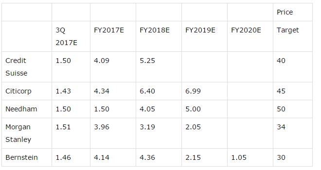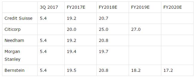 5家机构至少在2017三季度达成了一致预期,54亿美元,正好落在公司业绩预期的中位。