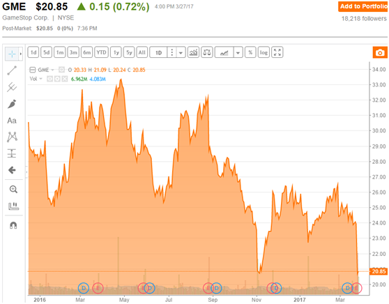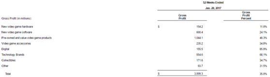 对于公司来说,现在游戏软件业务下滑已经是不争的事实。目前好多游戏都以DLC的方式发售,对以往的营销模式构成一种颠覆,传统零售兴盛的场景不再。2016年,作为占据公司总销售额30%的游戏软件业务录得2.5亿美元,大幅下滑对公司整体业绩造成打击。管理层预计2017年该领域还将持续下降。数字版的发行模式,以及DLC的营销方式,使玩家可以自行在家下载,大大降低了去实体店选购的需求,这就类似数字媒体的出现对实体CD行业的打击。