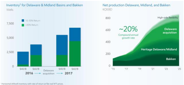 今年三月初,埃克森美孚(NYSE:XOM)CEO Darren Woods在纽约主持召开公司2017年分析师会议,会议主题主要围绕公司最近收购二叠纪盆地(Permian)土地一事。埃森克美孚收购的这块土地位于墨西哥东南部,此次收购不仅使公司预期产油量增加,还表明了公司通过非常规油气资源来创造价值的战略意图。此外,CEO称开发二叠纪盆地是“公司能撬动的短期杠杆”,公司可以根据市场油价表现来调整开发二叠纪盆地的进度,从而使公司更具灵活性。