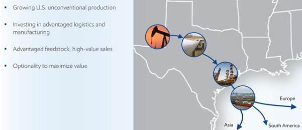 埃克森美孚的一体化还提现在下游与海湾地区公司的合作。埃克森美孚与Energy Transfer Partners成立了合伙公司,将二叠纪盆地和巴肯地区的石油运输到美国墨西哥湾沿岸的高流通性市场中去。埃克森美孚在美国的产量增加,再加上运输效率提升,埃克森美孚在墨西哥湾沿岸地区扩建三家炼油厂。