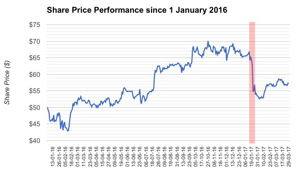 不过考虑到目前公司面临的诸多挑战,估值再保守一点,如果倍数调低到2016年的15.6倍,股价在70.5美元左右,大约有23%的上涨空间。