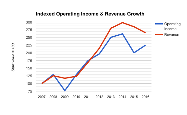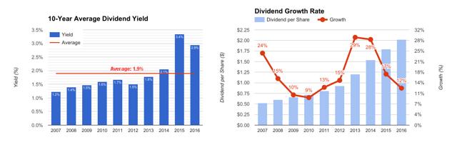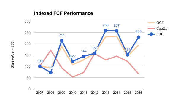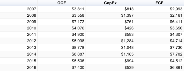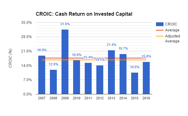 过去十年,表现最差的是2015年,CROIC只有10.6%,不过仍然高于10%,十年平均为17.6%,非常亮眼,去掉最高和最低调整后的平均为16.7%,相当地impressive!