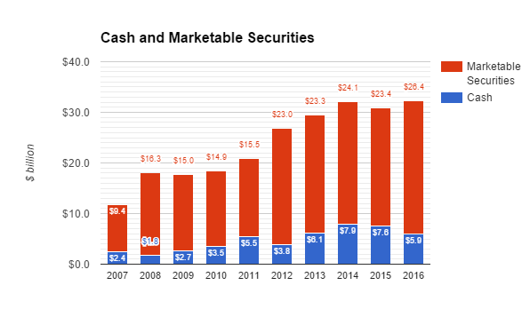 高通很多年都没有负债,只有近两年才开始的,主要是支付回购,因为高通大部分现金及现金等价物都在海外,为了避免高额的资金转移税,负债是最好的选择。
