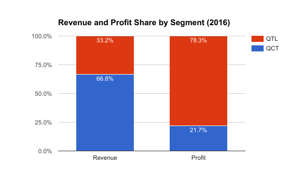 简单说来,高通的业务主要分为两大块,CDMA专用芯片部门QCT(Qualcomm CDMA Tech)和技术授权部门QTL(Qualcomm Tech Licensing)。前者主要负责研发和销售无线基础设施和设备中的芯片等软硬件方案,比如骁龙系列处理器,后者主要负责对高通历年积累和收购的技术专利进行授权。尽管芯片设计占总营收的比例超过60%,但公司利润主要来源于技术授权部门。