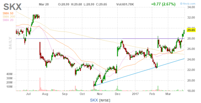 2016年的12月中旬和2017年的2月,斯凯奇的股价都未突破27.75美元的阻力位。但是在上周五,股价成功突破此阻力位,这也使的它的股价一路攀升至29.75美元左右的水平。下一轮的阻力位似乎是31.5美元,相比当前的股价高6%。
