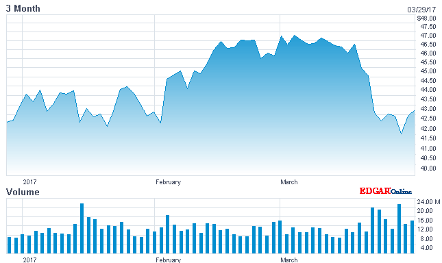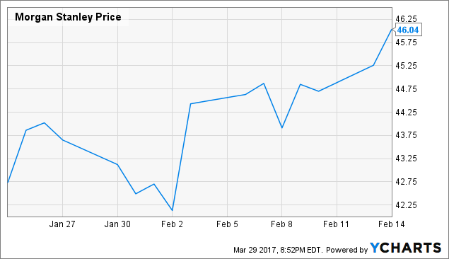 大摩的巨大潜力体现在交易业务部门,尤其是FICC(Fixed Income Currencies and Commodities,固定收益、外汇与大宗商品)部门。2015和2016年间,大摩的固定收益部门表现十分疲软,导致公司FICC部门裁员25%。2016年末终于出现转机,大摩第三季度营收为14.8亿美元,远超分析师预期的10.1亿美元。大摩股价也随之做出反应,再加上特朗普行情的驱动,大摩股价涨至52周新高。尽管随着市场的乐观情绪逐渐下降,过去几周中有一两天大盘股价下跌较大,但是大摩成功挺过了这次动荡,随着公司固定收益部门第三和第四季度表现亮眼,再加上每年第一季度的业绩普遍会非常强劲,大摩股价又开始上涨。