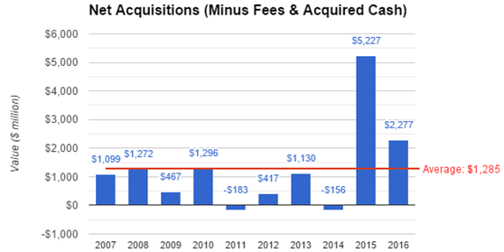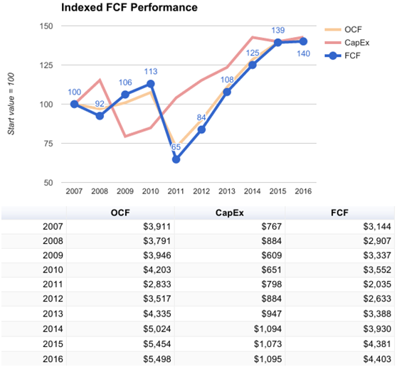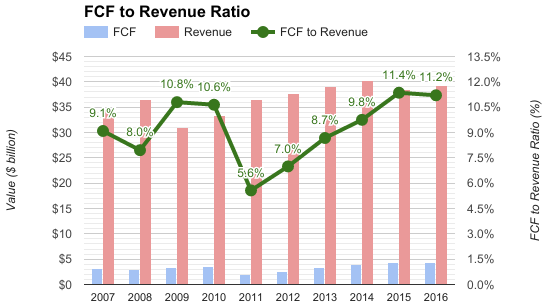 公司日后的现金流生成对于公司的未来经营是至关重要的,不仅要支持公司的运营,还要能够承受公司继续收购、回购、发放股息的压力。公司预计2017年自由现金流将会达到46-47亿美元,虽然2016年公司现金流有所下降,但主要是因为前几年公司通过扩张而产生收益的边际效益递减,可以看到公司在2011年自由现金流与收入比率一直在高速上升,直到2016年出现下降。