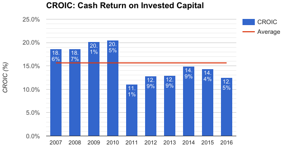 自2011年公司自由现金流达到最低点,之后5年始终保持增长,虽然2016年增长速度放缓。而且公司的投资资本现金回报CROIC常年处于较高水平,这一指标表示投资资金产生的自由现金流的比率,该值越高,就表示公司能够创造更多的现金,同时也代表了公司具有良好的盈利能力。尽管最近一年也是有所下降,但是也是依然保持在10%以上。