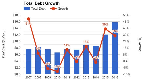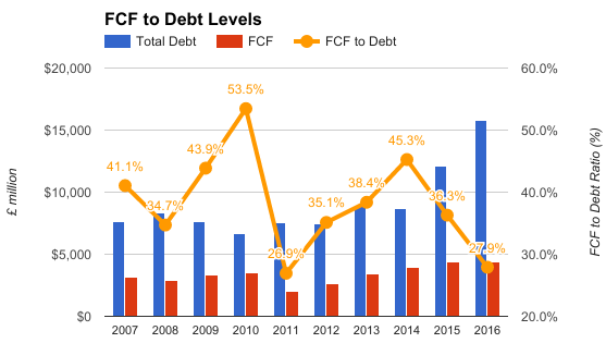 由于公司近年来的收购项目,公司的负债水平也是跟随上升,目前已经是十年前的两倍。
