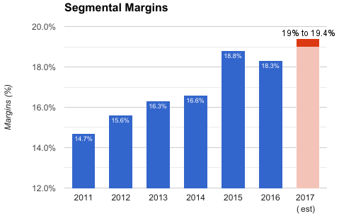 从公司发布的业绩预告来看,由债务和利润率下滑的现状来看,2017年还是充满着挑战。公司预计收入将会缓慢增长,但是会保持1-3%的有机增长,EPS预计在6.85-7.10美元,自由现金流增长5-7%,达到46-47亿美元。