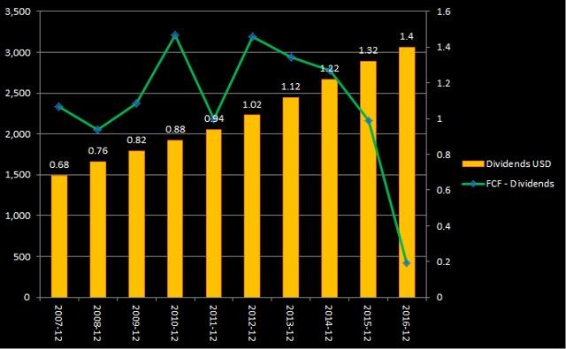 如前所述,可口可乐一直保持着上调股息的优良传统。例如,从2007年至2016年,可口可乐的每股股息由0.68美元上涨至1.4美元。因此,它的股利支出也由32亿美元上涨至60亿美元。但此处的问题是,可口可乐在此期间的现金流增速并未能与股息增速保持同步。