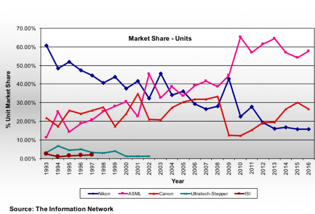 据相关机构统计,整个2016年,ASML销售了139台光刻机。在半导体设备行业的市场份额在58%左右,其他的对手包括尼康,佳能等。