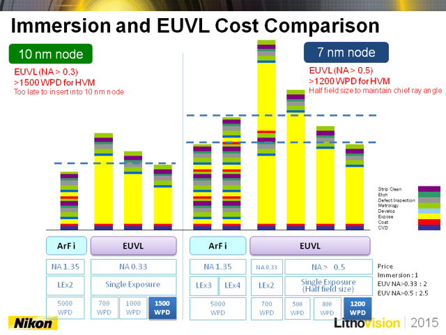 由于成本技术原因,ASML的对手尼康,佳能在高端光刻机上竞争力明显不足,但在中端产品市场仍有一定份额。置购成本(Cost of Ownership)是衡量购买哪个系统的一个关键指标,从尼康和佳能的CoO数据可以看出,影响置购成本的因素有很多,不仅包括设备,还包括材料等等。