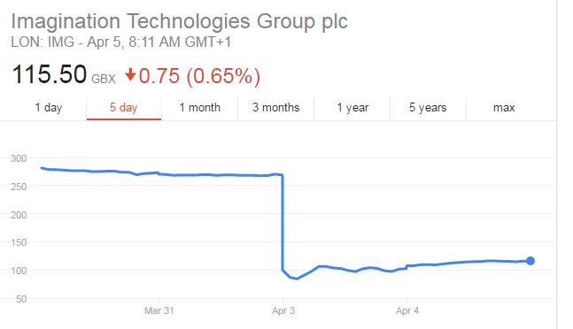 4月3日,苹果宣布将在未来两年内停止使用 Imagination Technologies Group PLC的图形处理芯片,并终止专利费支付。受此影响,Imagination Technologies 公司的股票暴跌逾60%,