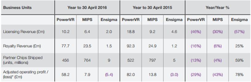Imagination的盈利模式与高通、ARM类似,主要授权IP的版税和专利费,收入随客户的出货量递增。截止去年6月30日的一年,公司营收1.2亿英镑,其中超一亿英镑来自版税收入;来自PowerVR的收入约8800万英镑,其中版税7770万英镑,许可费1000万英镑,使用PowerVR的芯片出货量4.56亿。