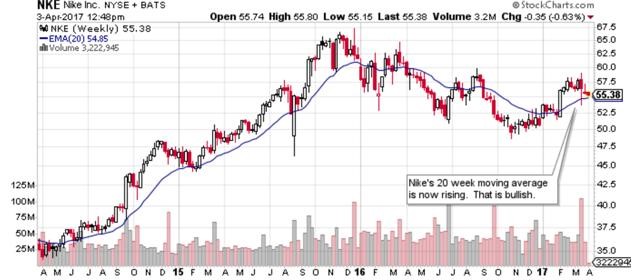 从技术面来看,耐克的股价未来可能走高。下图显示,自去年12月以来,耐克的股价有所反弹。当前其20日均线也在走高,这散发出积极的信号。接下来笔者认为耐克的股价将会突破60美元的价位。