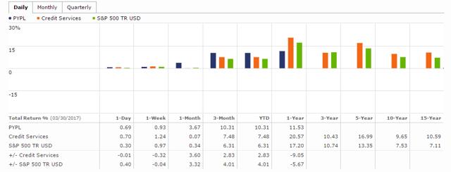 移动支付公司Paypal(NASDAQ:PYPL)是信用卡服务行业的龙头之一,2016财年公司营收超过108亿美元,相比之下,其竞争对手维萨卡公司(NYSE:V)、万事达卡(NYSE:MA)及美国运通(NYSE:AXP)2016年财年营收分别为159亿美元、108亿美元及321亿美元。脸谱网(NASDAQ:FB)可能也算得上是竞争对手,但脸谱网的最新年报显示公司支付业务的年营收才不到8亿美元。