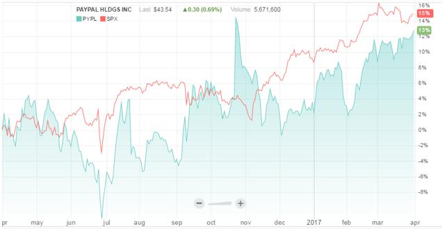 Paypal的股价自年初以来上涨10.3%,从表1看,年内公司回报率为11.5%,相比之下,信用卡服务行业及标普500指数的回报率分别为20.6%及17.2%。自2015年7月首次公开发售至今,Paypal的股价上涨了28%。公司当前股价约为43美元,稍低于2016年10月的历史高点44.24美元(见表2)。