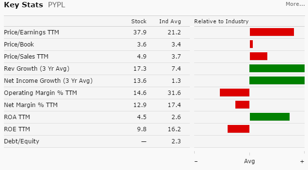 Paypal的估值很大程度上取决于全球每用户平均营收的增长。公司的各种指标高于行业平均水平,这证明市场对公司的营收增长具有信心。此外,营收增长对当前股价缺乏安全边际并没有改善。当前投资者面临的最大风险即公司营收增速放缓超出预期,如果营收增长过于缓慢,那么公司的市值将会严重缩水(参考LinkedIn)。在我看来,不错的预期收益已经反映在当前的股价水平上了,但预期收益与潜在的风险并不相称。