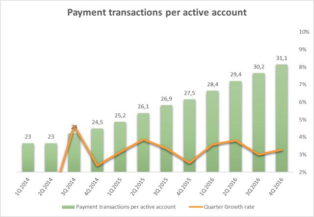 2016年第四季度,公司的活跃支付账号数量增加3%,达1.97亿。过去三年间,账号数量每季度按2.7%的平均增速逐渐增长。如表4所示,Paypal的客户基数呈线性增长。公司营收增长较快,其中仅有20%来自客户基数的平缓增长,剩下的来自公司每用户平均营收的增长。投资者在预测中期营收时应将两点因素都考虑在内。