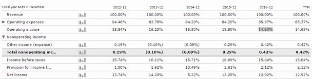 从表6看,Paypal的营业利润率(14.6%)表现不佳,比行业平均营业利润率31.6%要低一半左右,所以未来营业利润率改善的空间较大。此外,自2013财年起,公司的营业利润率逐渐下滑。净利润率也比行业平均低4.5%左右。因此,可预计公司2017财年的净利润率将可能进一步下降。