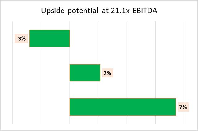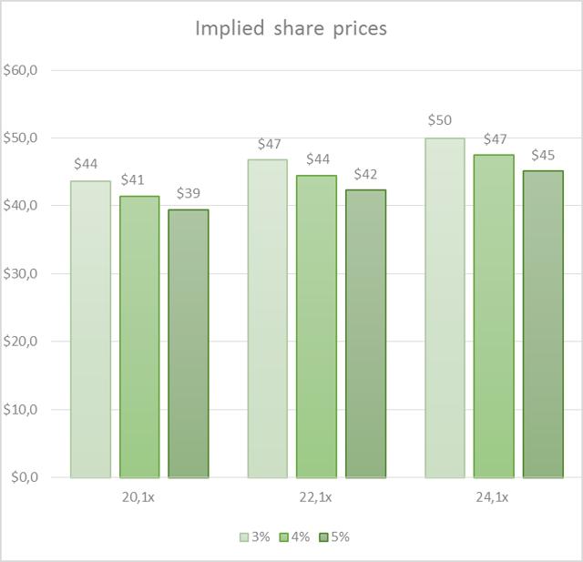 以上贴现现金流分析基于若干预设条件。敏感性分析选择了一系列不同的参数进行计算。通过输入不同的贴现率及企业价值倍数最终得出的公允值介于每股42美元至47美元,这与当前的股价十分接近(见表8)。
