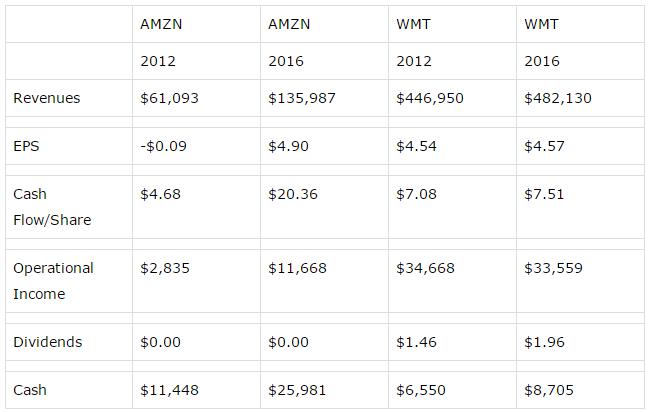 虽然目前亚马逊的营收仍然比不上沃尔玛,但是从增长速度来看两者完全不在同一级别。从2012年到2016年,亚马逊的营收翻了一倍多,而沃尔玛仅保持了个位数的增长。