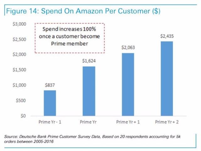 发展会员是亚马逊近些年来努力的方向,原因不仅仅在于会员费,还在于会员的黏性会让他们比非会员消费更多其他商品。下面是BI报道的关于德银的调查