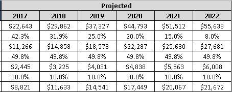 从彭博39位分析师的预测平均来看,预计2017财年(结束于2017年3月31)营收226亿美元,也就是同比42.3%的增长,这个增长比管理层近期表示的54%要低。2018财年(也就是今年Q2到明年Q1)预计营收298.6亿美元,同比增长31.9%。之后,从2019财年到2021财年,营收增长按年降5%,到2021年,增长率递减到15%,我们假设最终增长率为8%。