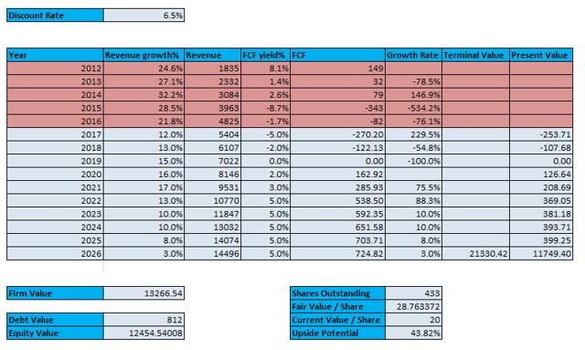尽管短期内安德玛的自由现金流为负,但保守估计未来公司创造的自由现金流营收占比为5%。同时,未来几年安德玛的营收继续保持增长,但增速呈放缓趋势。因此,笔者逐步将增速放缓,直至它降至3%(与GDP增速同步)。此外,贴现率设定为6.5%。
