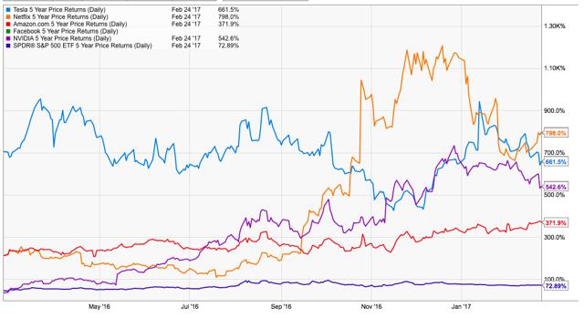 过去5年投资标普500收益率73%,但是投资特斯拉,奈飞,亚马逊,Facebook以及英伟达,收益率最低都是372%,最高达到800%。