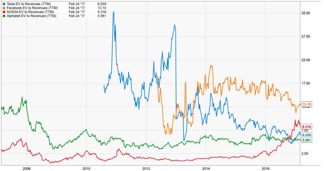 从市销率的角度看,英伟达似乎确实很贵,高达8倍多。从下图我们可以看到2016以前,英伟达的P/S也是在正常的2.5x左右。之后公司陆续发布了车载计算平台Drive PX2,Tesla P100巨型芯片,以及游戏显卡GeForce FTX1080,该值便一路飙升到8x以上。按目前TTM营收691亿美元计算,如果预计三年之后公司P/S回到3x,意味着投资者预期公司营收增长193%,达到2000亿左右,也就是说未来3年的营收增速年均达到43%。