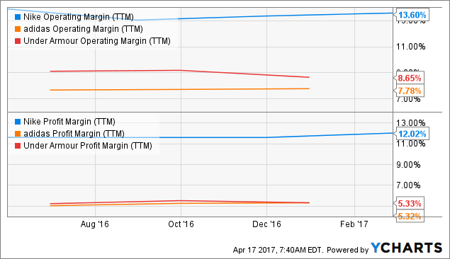 其次应该考虑的是三家公司的地理多样性和销售收入分布情况。耐克在北美市场上以147.64亿美元的销售收入占据主导地位(不包括收购的匡威的销售收入),阿迪达斯和安德玛的销售收入分别为41.31亿美元和40.05亿美元。北美市场之外,耐克与阿迪达斯的业绩旗鼓相当,分别为157.43亿美元和159.18亿美元,而安德玛却差强人意,收入仅为8.2亿美元。值得一提的是,在北美市场之外,阿迪达斯的销售收入首次超越耐克,这主要得益于有利的时尚趋势提升了阿迪达斯的鞋类销售收入。尽管笔者并不认为阿迪达斯的增长只是受一时的时尚提振,但投资者也不能低估潜在的风险。过去2年中,阿迪达斯40%的增长都得益于其超级明星系列产品的大卖,当前它所产生的收入占总收入的10%。若未来消费者对这一系列产品的兴趣下降,转而投向其它时尚趋势,那么阿迪达斯将很难复制当前的增速。