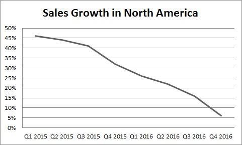 但安德玛的情况则完全不同。显然公司的增长部分是受一时的潮流所提振,斯蒂芬·库里的知名度在一定程度上也起到了推动作用。当前,安德玛在北美市场的增速在快速放缓,若未来继续以此速度下滑,那么安德玛的营收将很快进入负增长。安德玛的主要问题在于它不得不与知名度更高且财力更雄厚的两大行业巨头竞争。笔者曾多次听到很多人将当前的安德玛与上世纪90年代的耐克相提并论,他们认为安德玛也将像耐克那般实现复苏。但是笔者认为投资者应该立足于现实,同时应该考虑到两者所处的背景不太一样。耐克当时并不用面对来自比自身大4至6倍的对手的激烈竞争。与此同时,当时运动休闲装风靡使越来越多的年青人加入运动休闲的潮流,耐克从此趋势中获利颇丰。但安德玛并不具备规模优势,且它的产品并不符合当前的时尚潮流。同时,笔者认为安德玛在北美市场之外很难扩大市场份额,这主要是因为营销投入的局限性。此外,斯蒂芬·库里和汤姆·布雷迪可能在北美比较有号召力,但是在欧洲或拉丁美洲就不太管用。