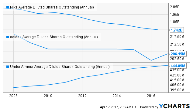 耐克的每股股息为0.68美元,股息收益率为1.3%;阿迪达斯的每股股息为2欧元,股息收益率为1.1%;而安德玛当前并不支付股息。此外,耐克在持续进行股票回购,以此减少流通在外的流通股数量。相较而言,阿迪达斯在这方面并不那么积极,而安德玛却恰恰相反,它的股东一直在遭受股权稀释之痛。