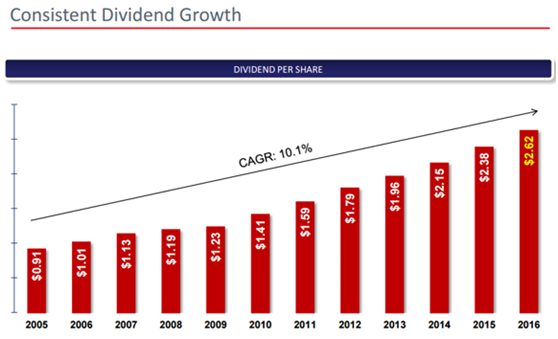公司自2009年开始,回购了51.15%的股票,当时2009年公司流通股为5.83亿股,2016年公司流通股仅为2.88亿股;同一时期,公司还支付了57亿美元的股息,更称道的是,公司在金融危机中表现良好,甚至还增加了股息。通过下图可知,公司的股息年复合增长率达到了10.1%。