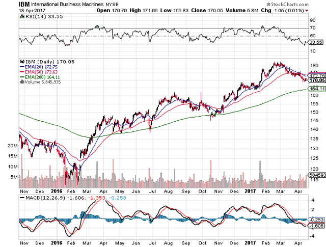 IBM(NYSE:IBM) 近期发布了2017财年第一季度财报,报告显示,IBM第一季度营收为181.55亿美元,比去年同期的186.84亿美元下降3%;净利润为17.50亿美元,比去年同期的20.14亿美元下降13%;持续经营利润为17.53亿美元,比去年同期的20.16亿美元下降13%。IBM第一季度调整后每股收益超出华尔街分析师预期,但营收则不及预期,盘后股价下跌逾4%。营收同比连续20个季度下滑,作为一支科技股,市场对公司的营收下滑特别在意。