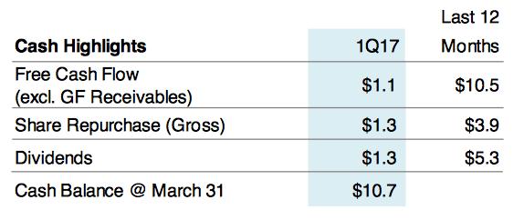 第一季度,IBM用于派发股息及股份回购的资金均为13亿美元,年化收益率为6.6%。本季度公司加快了股票回购,未来160美元以上的股价水平算不上贵。