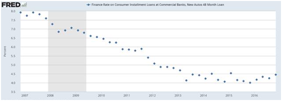 2016年90天以上的汽车贷款拖欠率已经上升至3.6%,纽约联邦储备委员会指出,600万等级较低的借款人贷款期限至少延迟了90天。数据显示,银行和信用合作社去年的犯罪率有所下降,但是汽车金融公司的犯罪率则上升了1%。