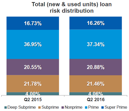 借款人实际支付的利率主要取决于他们的信用评分,与金融机构主要贷款收入来自于小部分的高净值客户不同,汽车贷款有45%的风险敞口都集中特级和一级一下评分的借款人。