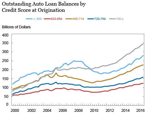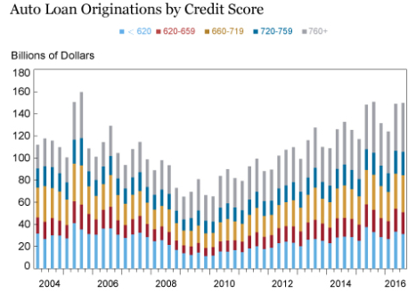 此外,自2009年之后,汽车信贷一级以下借款人的贷款规模已经达到600亿美元;2016年每季度大约有300亿美元是发放给信贷评分低于620份的四级借款人。
